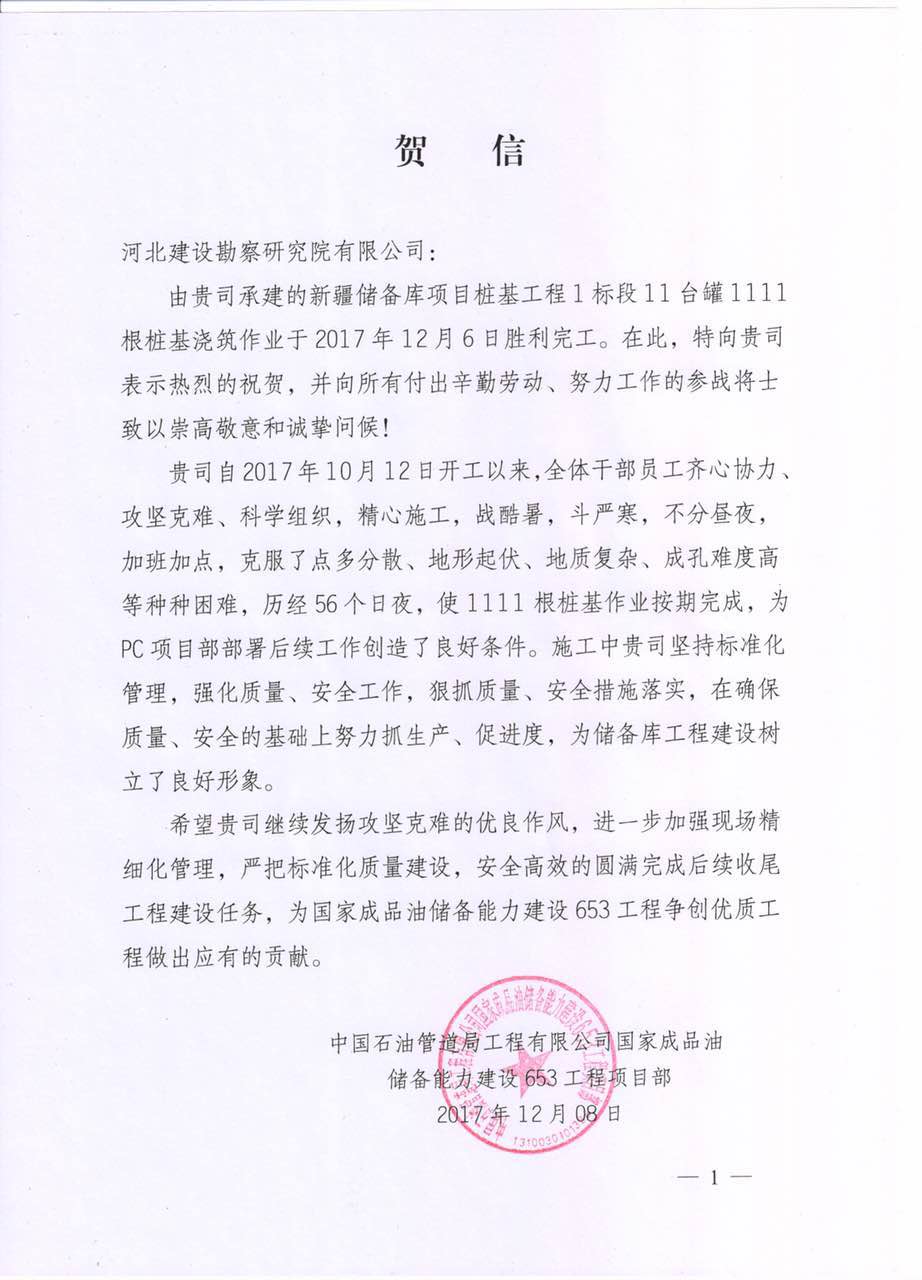 我公司承建的新疆儲(chǔ)備庫(kù)項(xiàng)目樁基工程1標(biāo)段11臺(tái)罐1111根樁基澆筑作業(yè)于2017年12月6日勝利完工。中國(guó)石油管道局工程有限公司國(guó)家成品油儲(chǔ)備能力建設(shè)653工程項(xiàng)目部發(fā)來(lái)賀信,對(duì)我項(xiàng)目部重安全,重質(zhì)量的工作作風(fēng)表示充分地肯定,也對(duì)我項(xiàng)目部為儲(chǔ)備庫(kù)工程建設(shè)樹(shù)立良好形象提出了表?yè)P(yáng)。