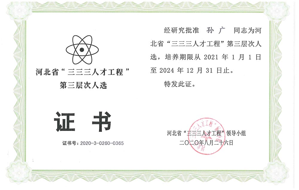經(jīng)公司申報、石家莊市人力資源和社會保障局推薦,河北省“三三三人才工程”領(lǐng)導(dǎo)小組批準(zhǔn),公司張開偉同志榮獲2020年度河北省“三三三人才工程”第二層次人選,韓文永、孫廣兩名同志榮獲2020年度河北省“三三三人才工程”第三層次人選。