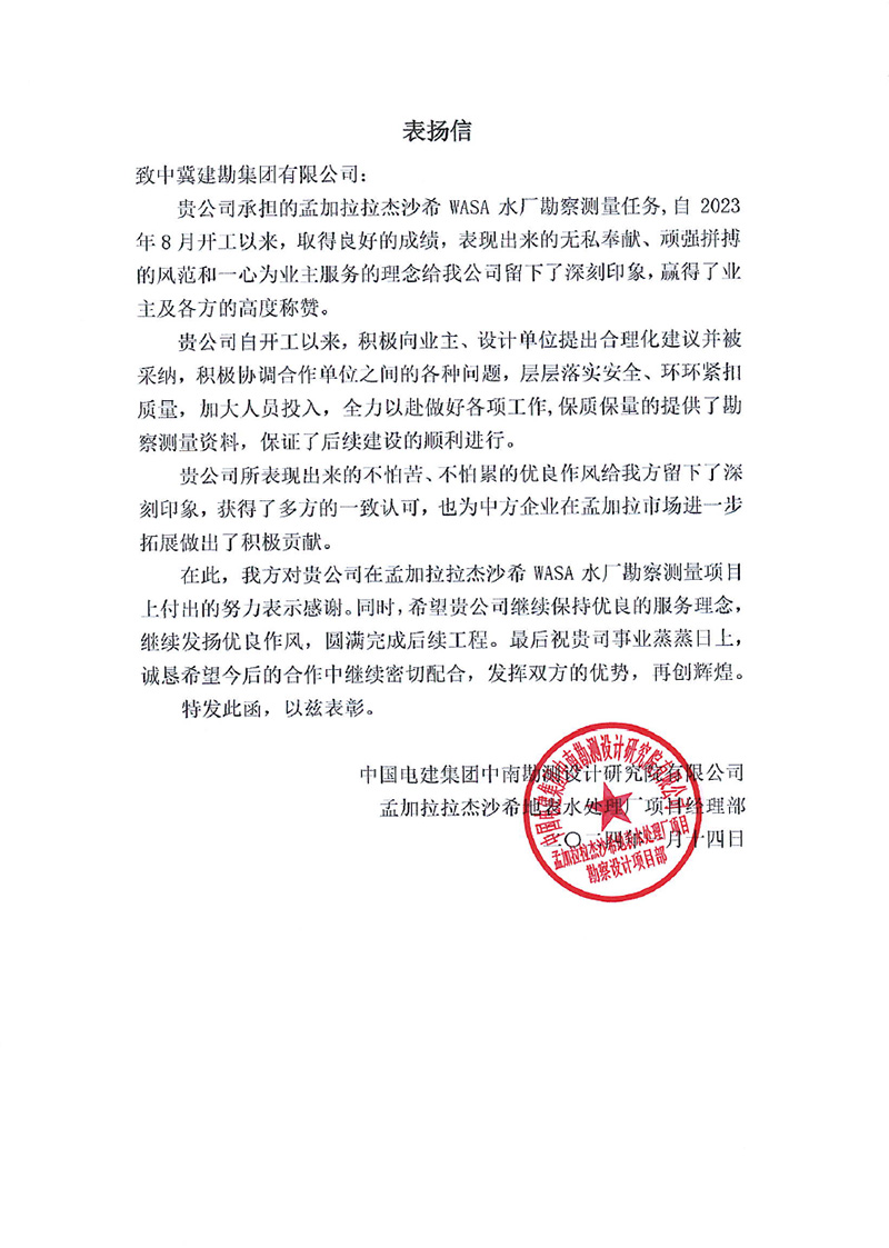 中國(guó)機(jī)械設(shè)備工程股份有限公司發(fā)來(lái)的表?yè)P(yáng)信,對(duì)在烏茲別克斯坦謝拉巴德 500MWp/456.6MWac 太陽(yáng)能電站項(xiàng)目建設(shè)過(guò)程中,項(xiàng)目全體人員克服諸多不利因素,發(fā)揚(yáng)建勘精神,盡一切努力推進(jìn)工程建設(shè),以及公司的專業(yè)性、敬業(yè)態(tài)度和管理水平給予了高度評(píng)價(jià)。同時(shí),對(duì)項(xiàng)目管理團(tuán)隊(duì)及所有參建人員表示由衷的感謝,并希望雙方精誠(chéng)合作,攜手并進(jìn),共同推進(jìn)其他項(xiàng)目的開發(fā)建設(shè)。