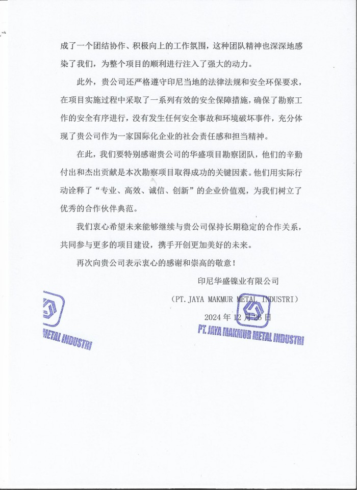 印尼華盛鎳業(yè)有限公司發(fā)來了表揚信。在印尼華盛鎳業(yè)有限公司一期冶煉廠、電廠地質勘察項目及印尼華盛-年產(chǎn)200萬噸綜合鋼鐵項目的勘察任務中,印尼華盛勘察項目部全體職工迅速適應印尼當?shù)氐膹碗s環(huán)境和炎熱的氣候條件,克服了語言溝通、文化差異以及交通不便等諸多困難,全身心地投入到工作中。在項目實施過程中,嚴格遵守印尼當?shù)氐姆煞ㄒ?guī)和安全環(huán)保要求,采取了一系列有效的安全保障措施,確保了勘察工作的安全有序進行。這種高度的專業(yè)素養(yǎng)和社會責任感,贏得了業(yè)主方的高度贊揚和深深感激。