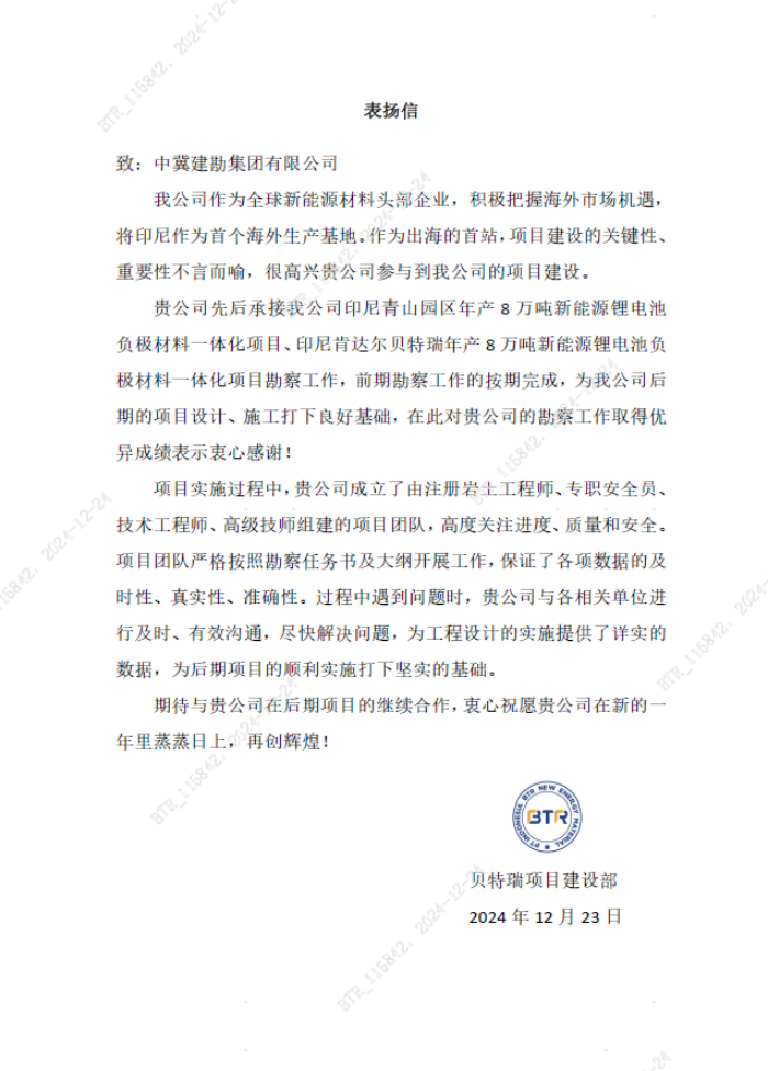 近日,公司收到了來自多方業(yè)主單位的感謝信及表揚信,表彰公司在孟加拉、印尼、沙特及國內多個重要項目中,展現(xiàn)出的卓越項目管理能力、技術實力、團隊協(xié)作及不懈努力。各業(yè)主單位對公司在工程勘察、施工管理、技術方案執(zhí)行、質量控制和安全生產(chǎn)等方面給予了較高認可,并送上了誠摯的祝福。